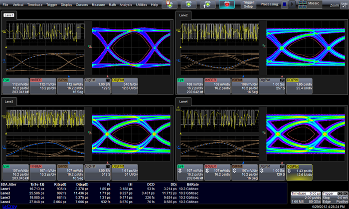 LabMaster 10Zi可以很好支持目前在发展的10-12Gb/s信号技术,如40/100 GBASE-R以太网和12G SAS,通过4个(甚至更多)通道提供80GS/s采样率和36GHz带宽实现测试。超高速技术,如CEI-25/28, CEI-56和相干光调制通信系统(DP-QPSK, 16-QAM, MIMO, Few-Mode Fiber)可以通过业界最高的65GHz带宽和多个通道实现测试。力科出品的SDAIII-CompleteLinQ串行数据和串话分析软件包可以实现更多的测试能力,来支持同步多路眼图,抖动,垂直噪声和串话分析。